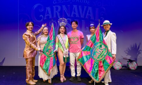 パレードには隊列には、3週間後に控える浅草サンバカーニバルでお披露目する衣装を“部分的”に着用したメンバーの姿も(完全版衣装は浅草本番までマル秘)。大型スピーカーを搭載したPA車も加わり、最新のサンバ・ヂ・エンヘード「乾杯!あなたとサウーヂ!~Vamos brindar! Chama “Saúde!!” com você!」の演奏とダンスで、渾身のパフォーマンスを披露しました。