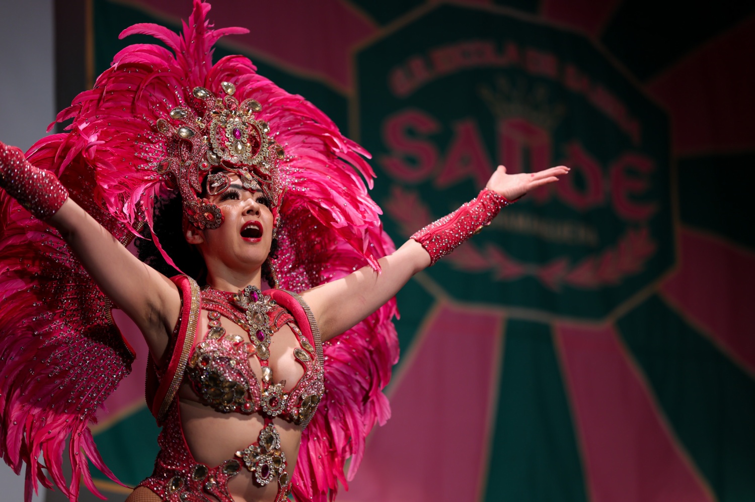 ハイーニャ・ヂ・バテリア(Rainha de Bateria)は、サンバチームの打楽器隊(バテリア)の先頭で踊る「バテリアの女王」と呼ばれるトップダンサーです。チームに1人だけ存在し、華やかな衣装と抜群のダンスでバテリアを鼓舞・紹介する最も重要な役割を担います。